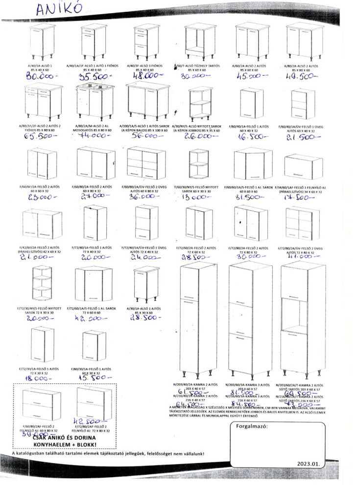 Az Anikó konyhabútor bővíthető vagy szűkíthető az elemjegyzék alapján.
