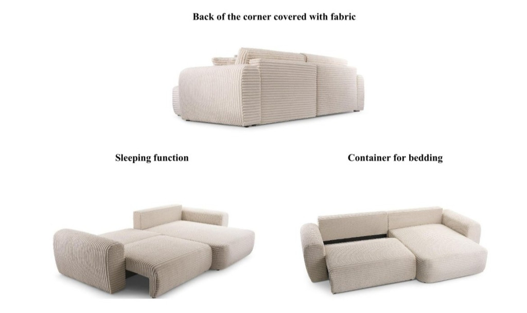A sarokülőben elhelyezett tárolórész praktikus megoldást kínál az ágyneműk, takarók és párnák elhelyezésére, így minden szükséges textília könnyen elérhető, mégis rendezett marad.