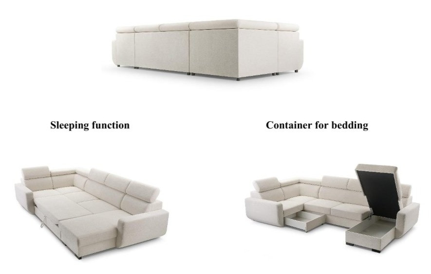 U alakú kialakításának köszönhetően egyszerre több személy számára kínál kényelmes ülőhelyet, így ideális családi együttlétekhez, baráti beszélgetésekhez vagy hosszabb pihenéshez. A sarokülő automata alvásfunkcióval és két külön ágyneműtartóval rendelkezik, így nemcsak látványos, hanem kiemelkedően praktikus megoldás is.
