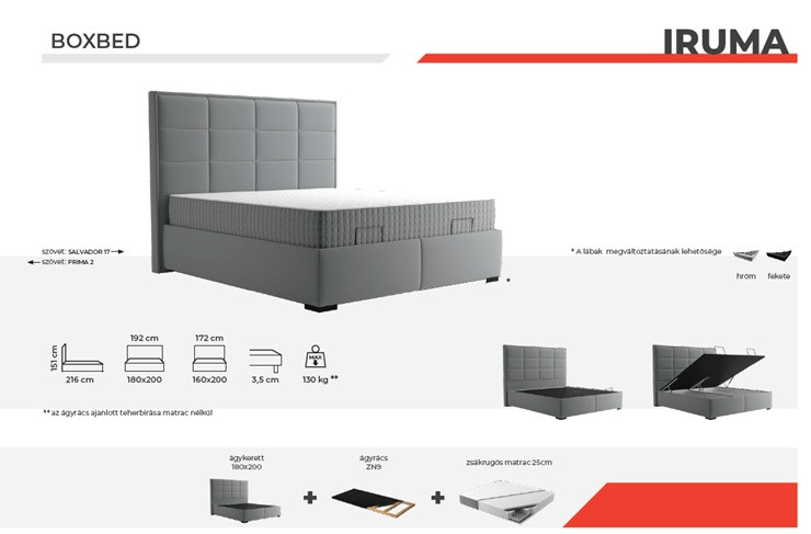 Az Iruma franciaágy egy impozáns megjelenésű, kényelmes és tartós ágy, amely a hálószoba elegáns középpontjává válik. A 180×200 cm-es fekvőfelületet biztosító modell az ágykeret mellett tartalmazza az ágyrácsot és a prémium táskarugós matracot is. A magas, párnázott fejtámla modern, stílusos megjelenést biztosít, miközben kényelmes támaszt nyújt olvasáshoz vagy pihenéshez.