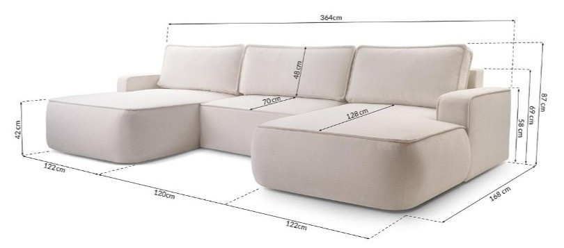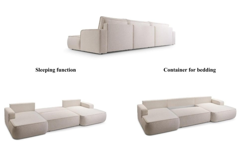 Az U alakú kialakítás több személy számára biztosít kényelmes helyet, legyen szó családi együttlétekről, baráti beszélgetésekről vagy hosszabb pihenésről. A puha párnázás és a széles chaise longue gondoskodik a kellemes komfortérzetről, míg az alvásfunkció és a beépített ágyneműtartó a mindennapok praktikumát erősíti.