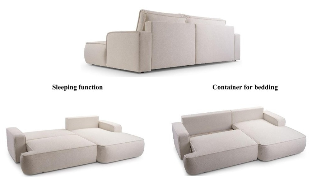 A puha párnázás és a tágas chaise longue kényelmes pihenést kínál, legyen szó relaxálásról, filmnézésről vagy vendégek fogadásáról. A sarokülő alvásfunkcióval és beépített ágyneműtartóval is rendelkezik, így praktikus megoldást nyújt kisebb és közepes méretű nappalikba egyaránt.